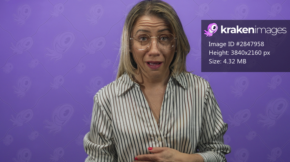 Woman laughing with hand on chest wearing striped blouse in studio against purple setting; happiness.