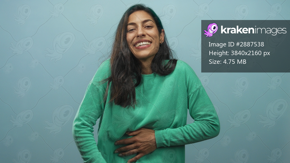 Woman laughing with hand on stomach wearing green sweater in studio against blue backdrop; warm happiness.