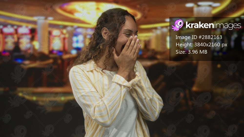 Woman laughing with hands covering mouth at slot machine in casino building; surprise winning moment.