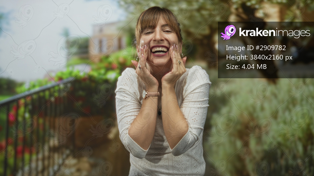 Woman laughing with hands on cheeks standing by railing with blurred building and greenery in park; joy playful candid moment.