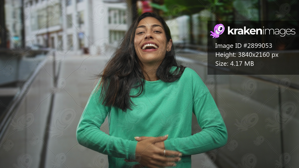 Woman laughing with hands on stomach and closed eyes on city street near glass building, wearing green sweater; joy spontaneity.