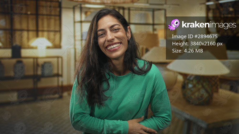 Woman laughing with hands on stomach, wearing green sweater, surrounded by table lamps in a shop building; joy connection.