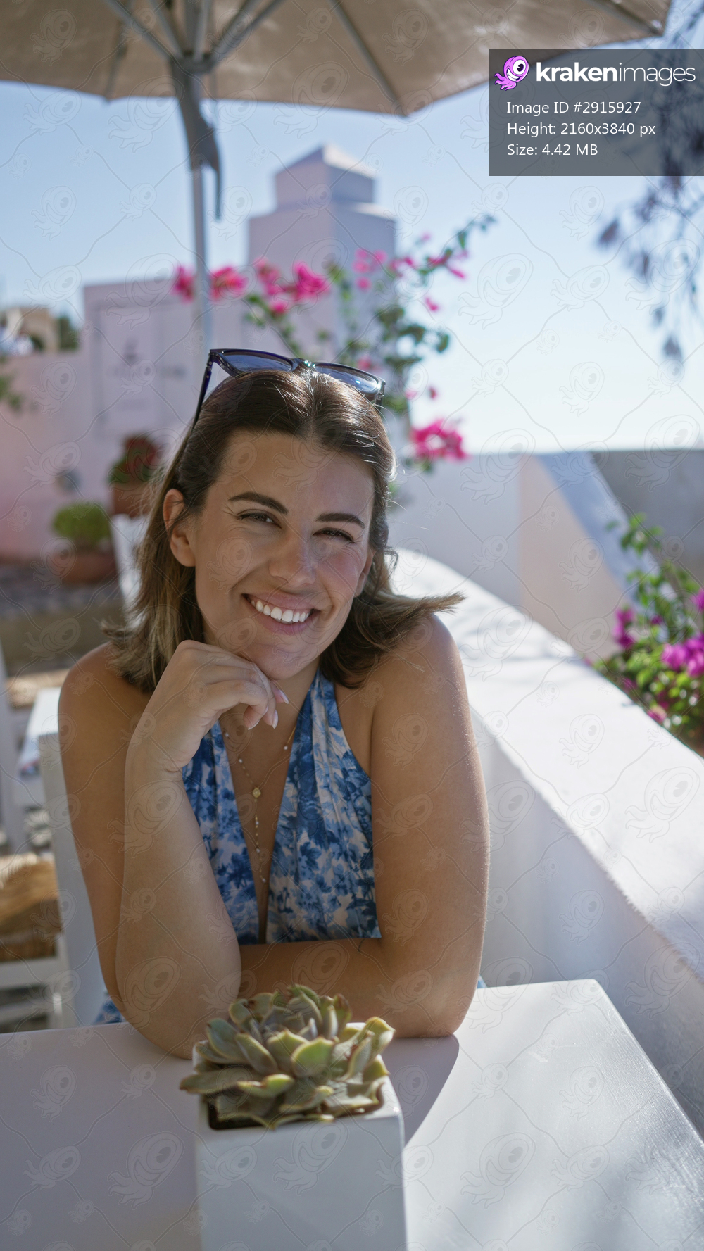 Woman laughing with hands on table at terrace restaurant in santorini town; summer joy relaxation bliss.
