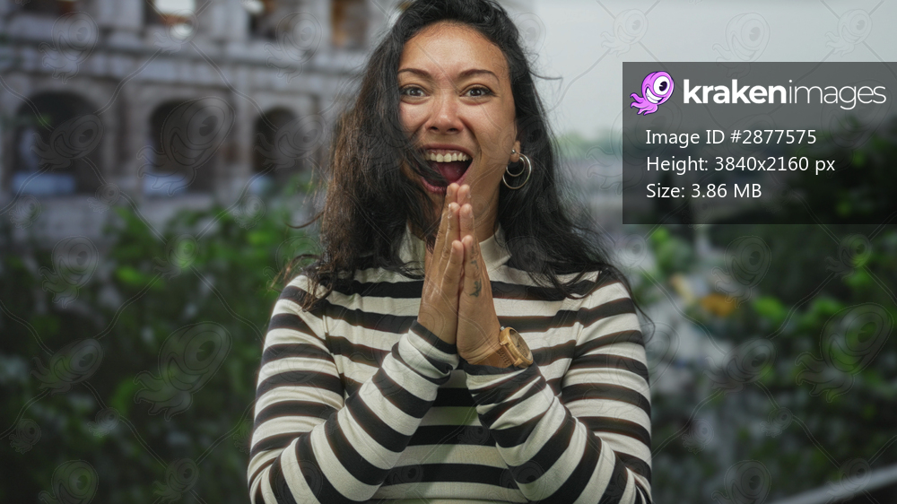 Woman laughing with hands pressed together at roman coliseum building, striped sweater and hoop earrings visible, outdoor tourist scene; joy travel.