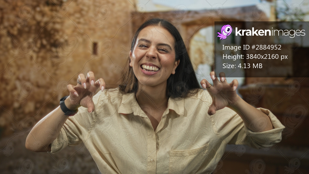 Woman laughing with hands raised on a street in an old town, open mouth and playful clawing gesture; joy spontaneity.