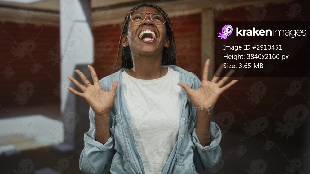 Woman laughing with hands raised, wearing glasses and a light denim shirt, standing inside a building under construction with exposed brick and a concrete column; joy celebration optimism. - Kraken Images