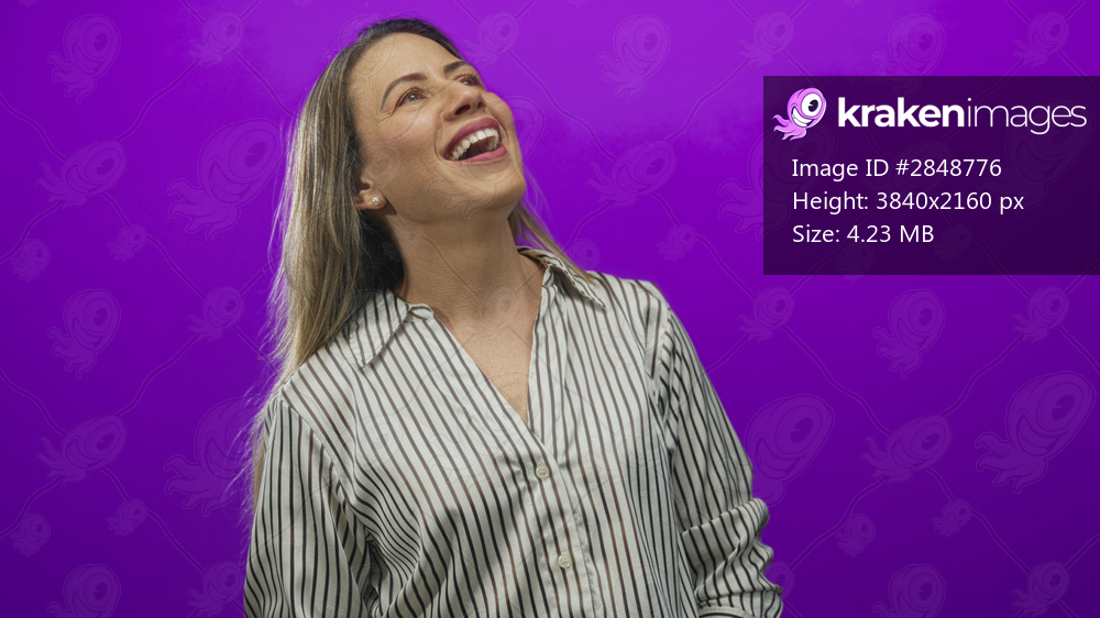Woman laughing with head thrown back wearing a white striped shirt in bright purple studio setting; joy.