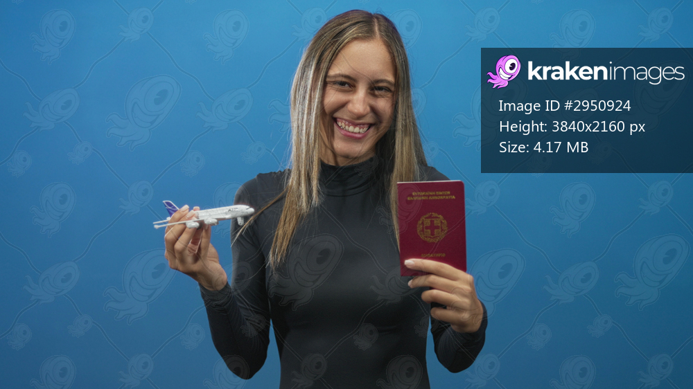 Woman laughing with head tilted back holding passport and model airplane in studio smiling broadly and playful pose; travel excitement joy.