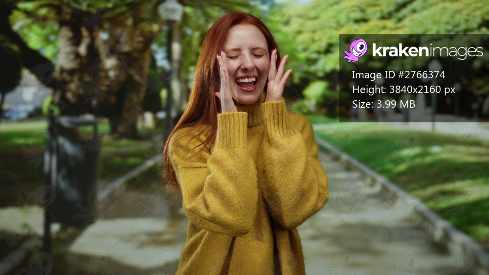 Woman laughing in a bright yellow sweater with red hair in a sunny park setting showcasing autumn beauty and vibrant outdoor nature.
