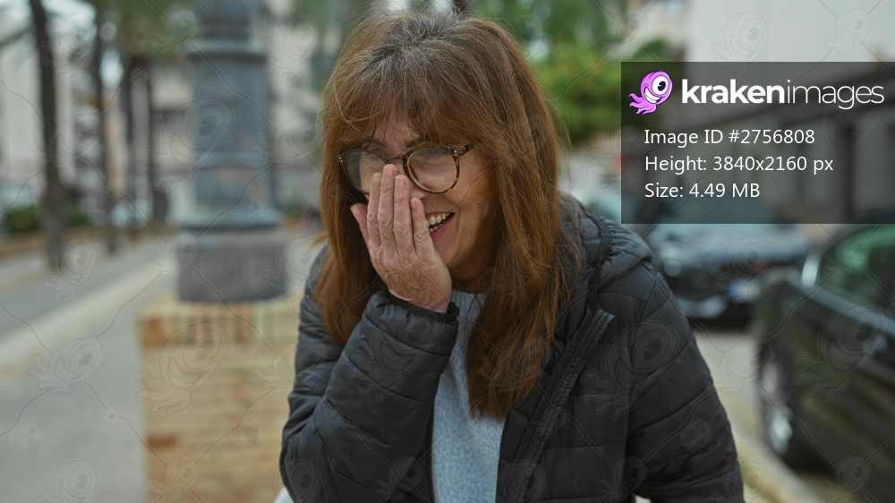 Woman laughing joyfully covering face in city street with cars and trees, wearing glasses and jacket in an outdoor setting on a chilly day.
