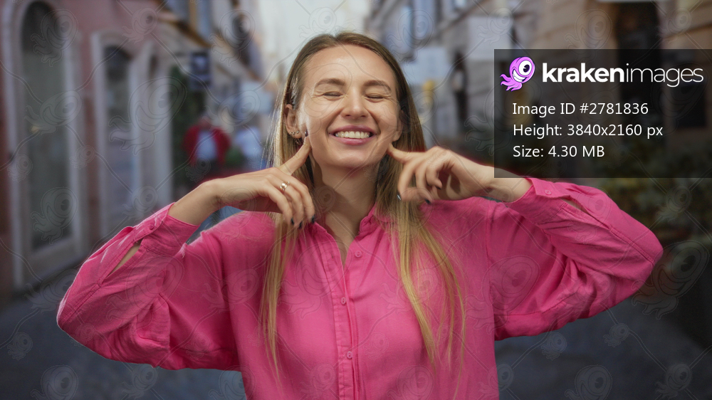 Woman laughing joyfully on a bustling city street, wearing a vibrant pink shirt, capturing a moment of happiness and carefree expression in an outdoor urban setting. - Kraken Images