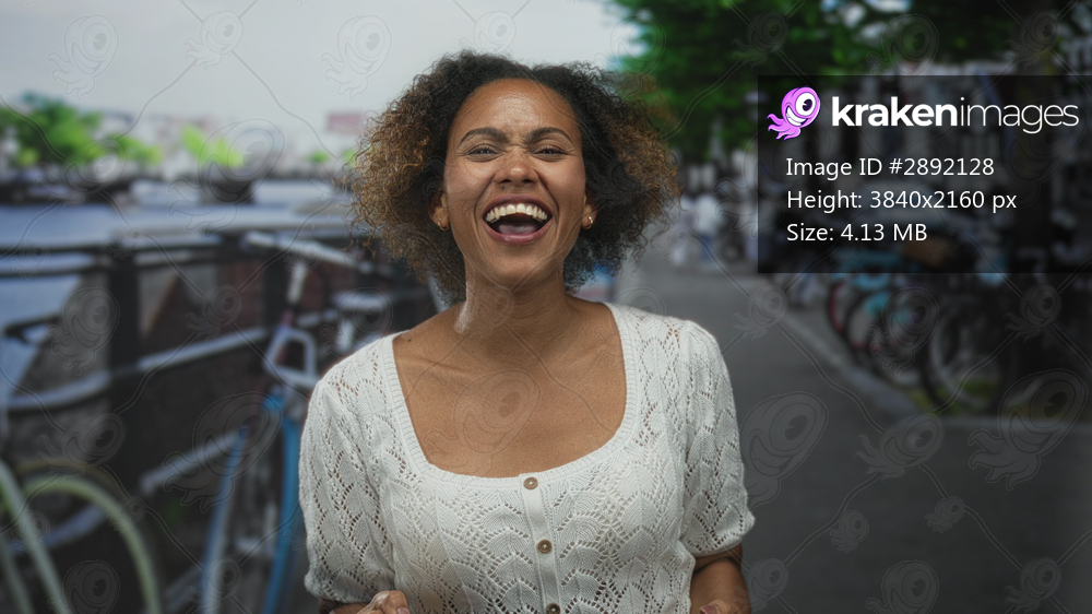 Woman laughing with mouth open and raised fist on amsterdam street canal with parked bicycles, wearing white knit top; joy celebration.