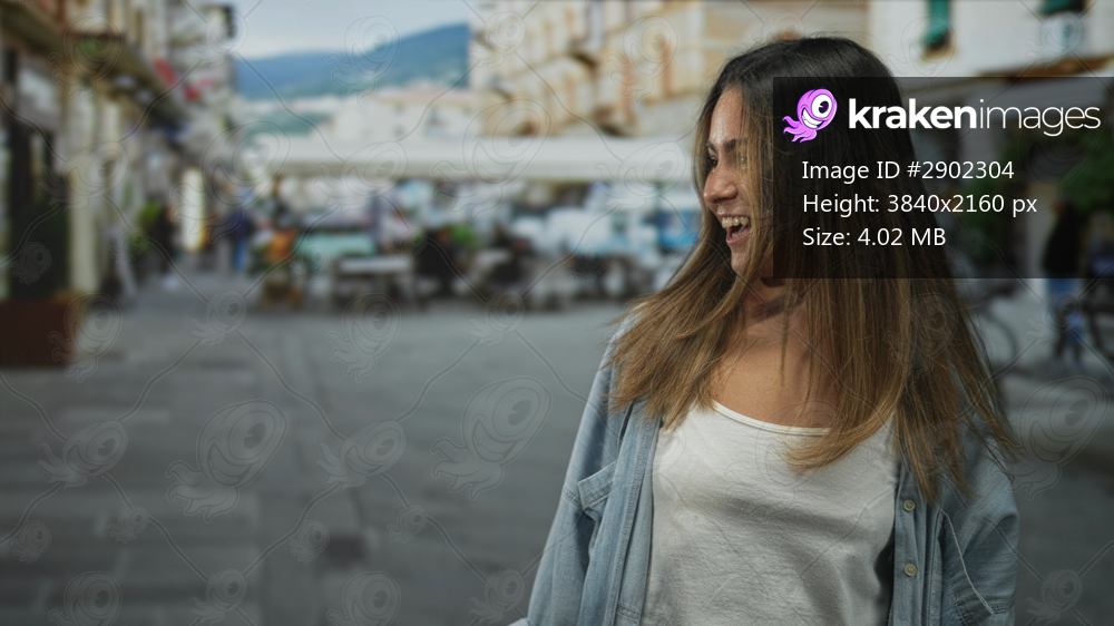 Woman laughing on a city street wearing a white tank top and denim shirt, hair in motion; carefree joy.