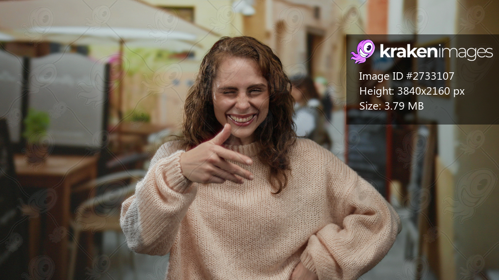 Woman laughing on a restaurant terrace in a city street, wearing a cozy sweater, with blurred tables and menu boards in the background.
