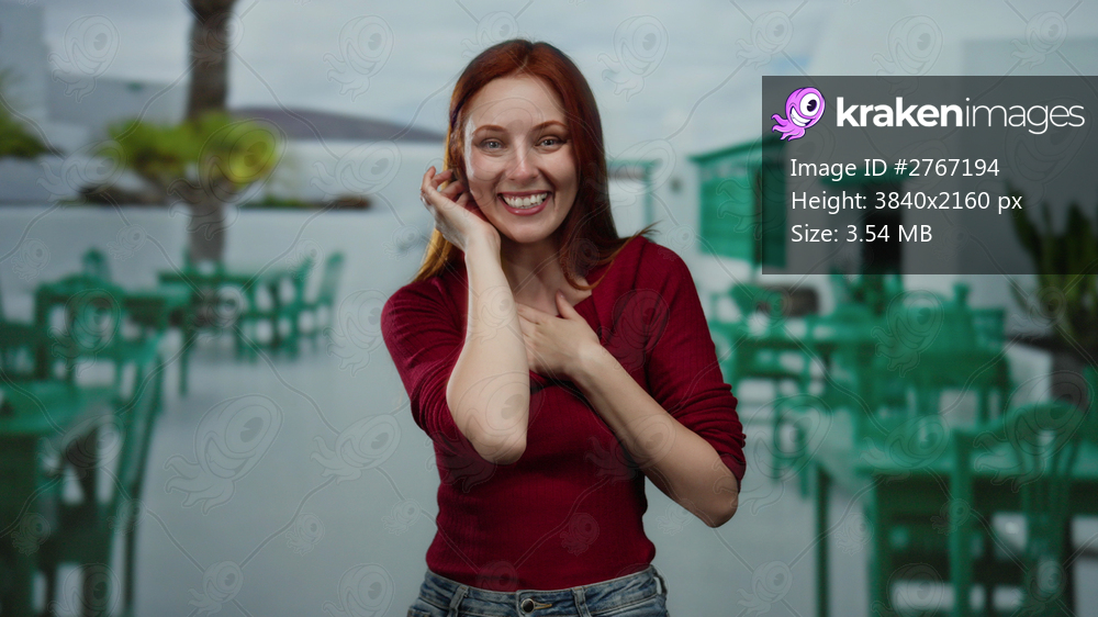Woman laughing on terrace with red hair and red shirt in outdoor restaurant setting featuring green chairs and white buildings under cloudy sky.