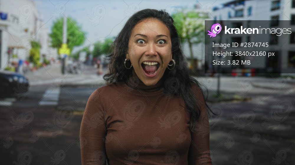 Woman laughing with open mouth looking up on street near crosswalk and storefronts in city; joy wonder.