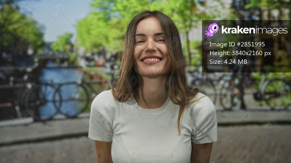 Woman laughing and pointing finger to camera on street with bicycles beside canal water; joy adventure discovery.