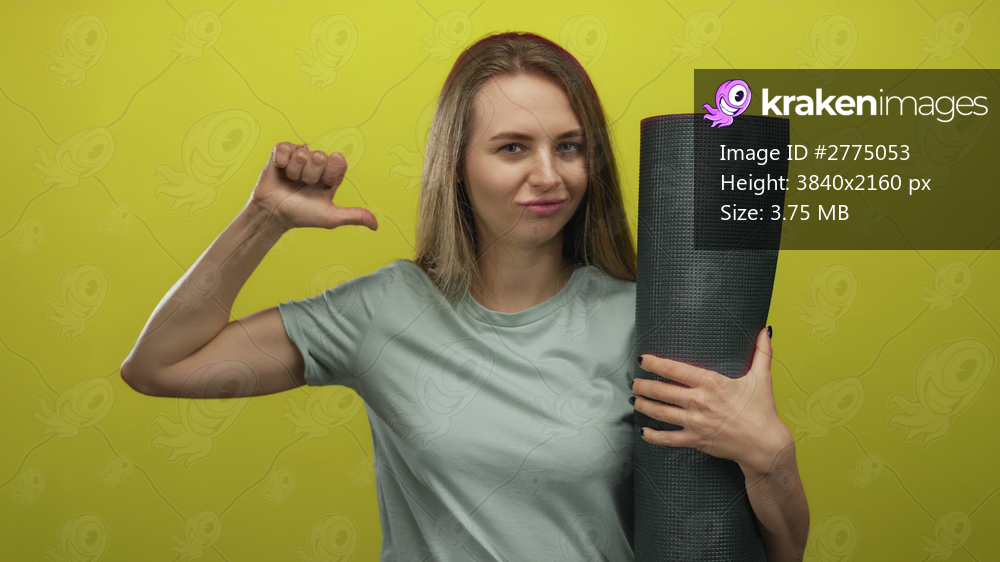 Woman laughing and pointing to herself with yoga mat against isolated yellow background showcasing joyful self-pride and fitness readiness