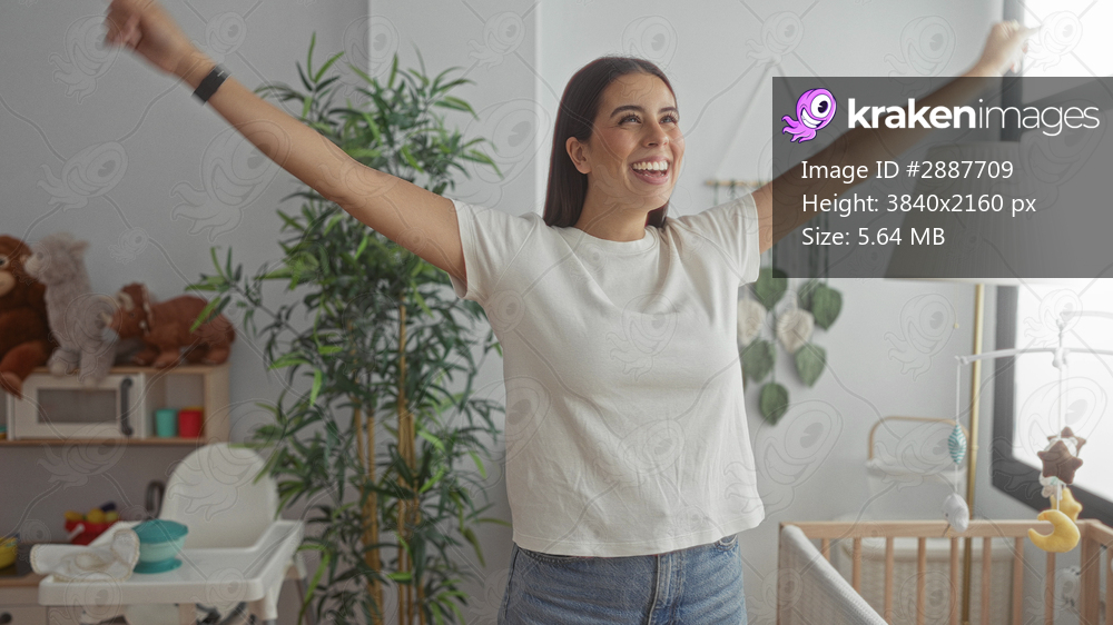 Woman laughing with raised arm by crib in bedroom, nursery mobile and toys visible near window; joy motherhood.
