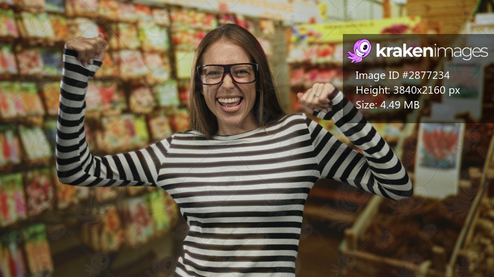 Woman laughing with raised fists and visible hands among flower seed packets on shelves in a building market aisle, wearing glasses and striped shirt; joy celebration. - Kraken Images