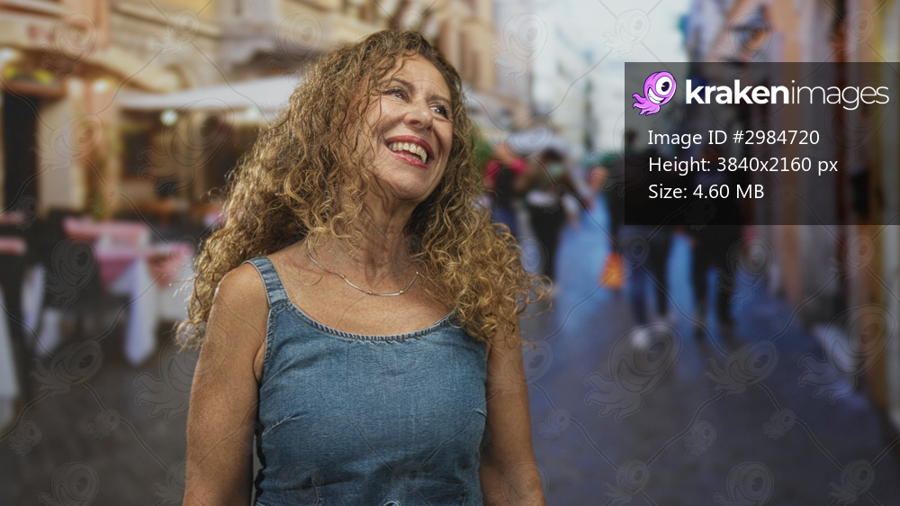Woman laughing, shoulder visible, head tilted back while wearing denim dress on a cobblestone street; carefree joy.