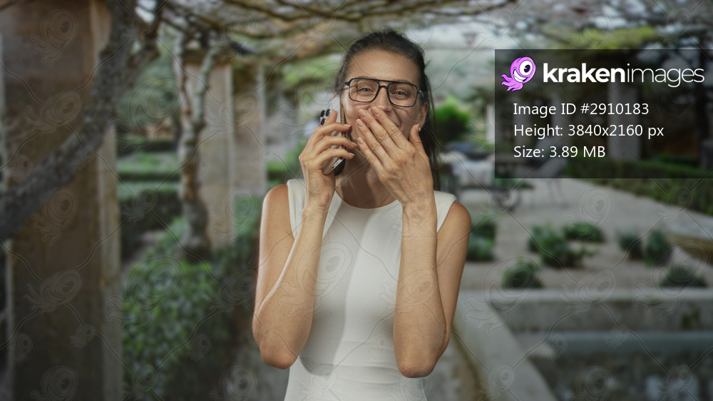 Woman laughing while holding smartphone to ear and covering mouth in a building courtyard framed by stone columns and hedges; joy.