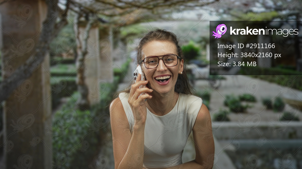 Woman laughing while holding smartphone to ear and covering mouth in a building courtyard framed by stone columns and hedges; joy.