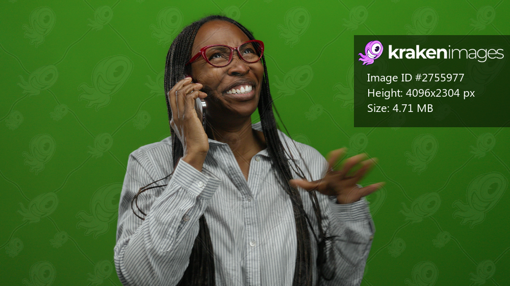 Woman laughing while talking on cellphone against isolated green background showcasing joyful communication.