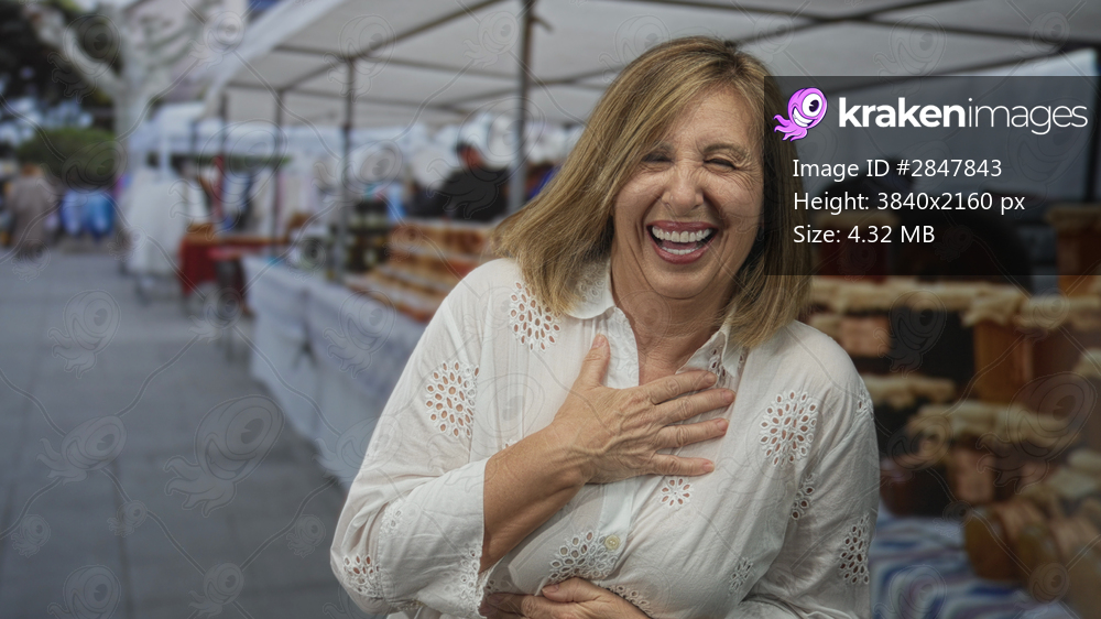 Woman laughs with hand on chest at outdoor street market with souvenir stalls and pottery tables; gratitude.