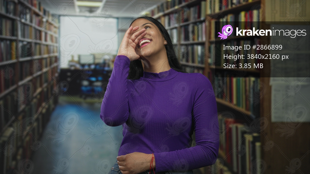 Woman laughs and holds her stomach amid tall library shelves in a quiet aisle wearing a purple sweater; happiness.