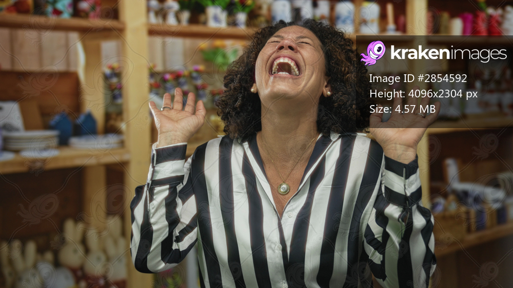 Woman laughs with raised hands in a decor store nestled among wooden shelves of home accessories; joyful moment.