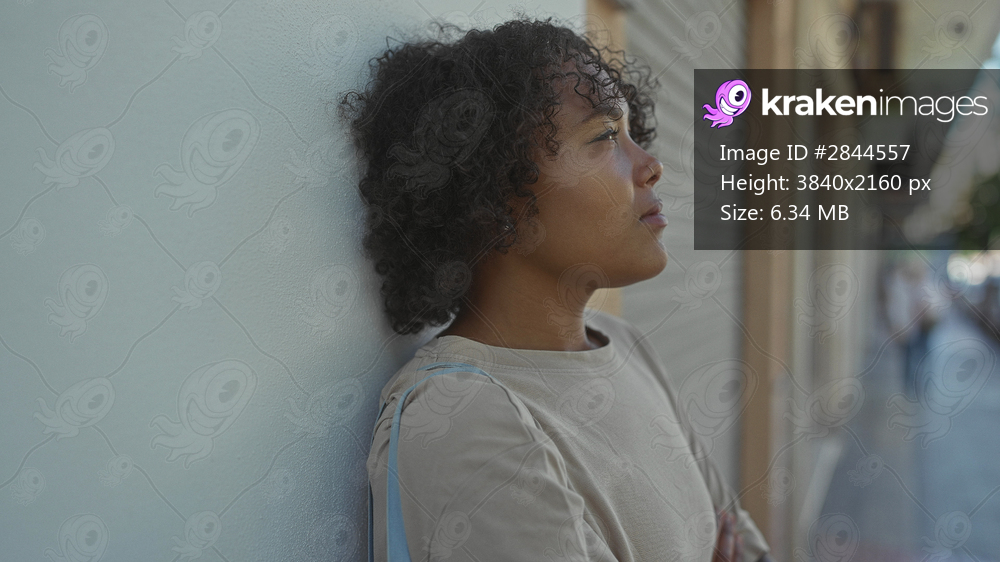 Woman leaning against wall on city sidewalk with face turned upward and eyes looking skyward; quiet reflection.