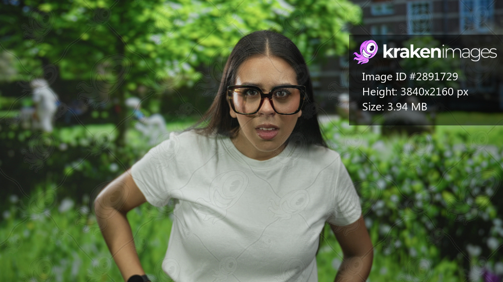Woman leaning forward with hands on hips wearing oversized glasses in front of building and green park; surprise questioning.