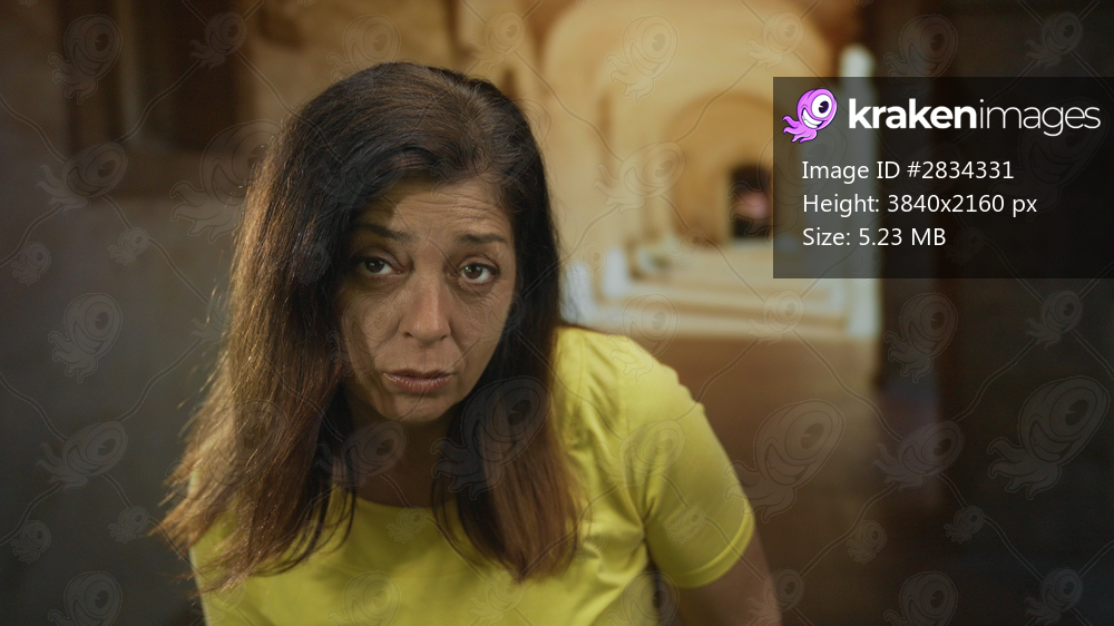 Woman leaning forward showing face in outdoor corridor of old university building with gaze fixed on lens; curiosity.