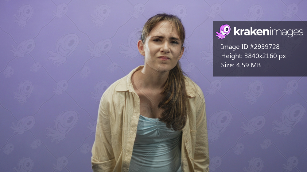 Woman leaning forward with squinted eyes and serious frown, wearing light blue top and beige shirt against a purple studio wall; frustration.