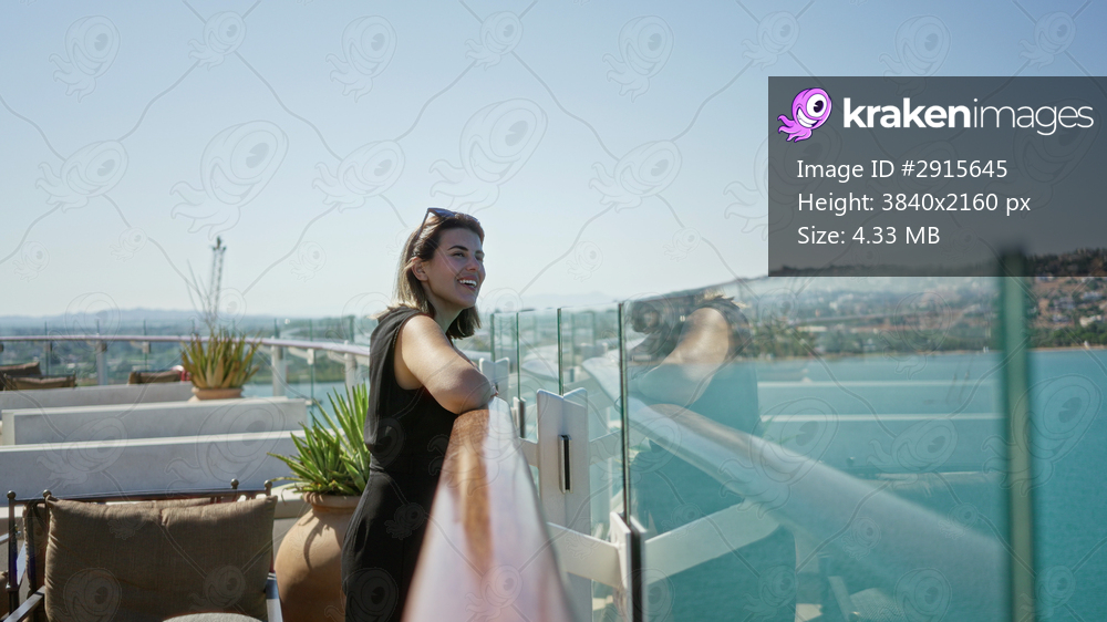 Woman leaning on glass rail with bare forearm resting on cruise ship deck railing, smiling toward sea and distant shore; serenity travel.