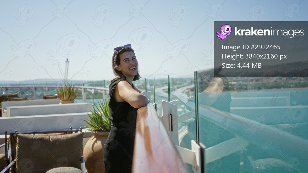 Woman leaning on glass rail with bare forearm resting on cruise ship deck railing, smiling toward sea and distant shore; serenity travel.