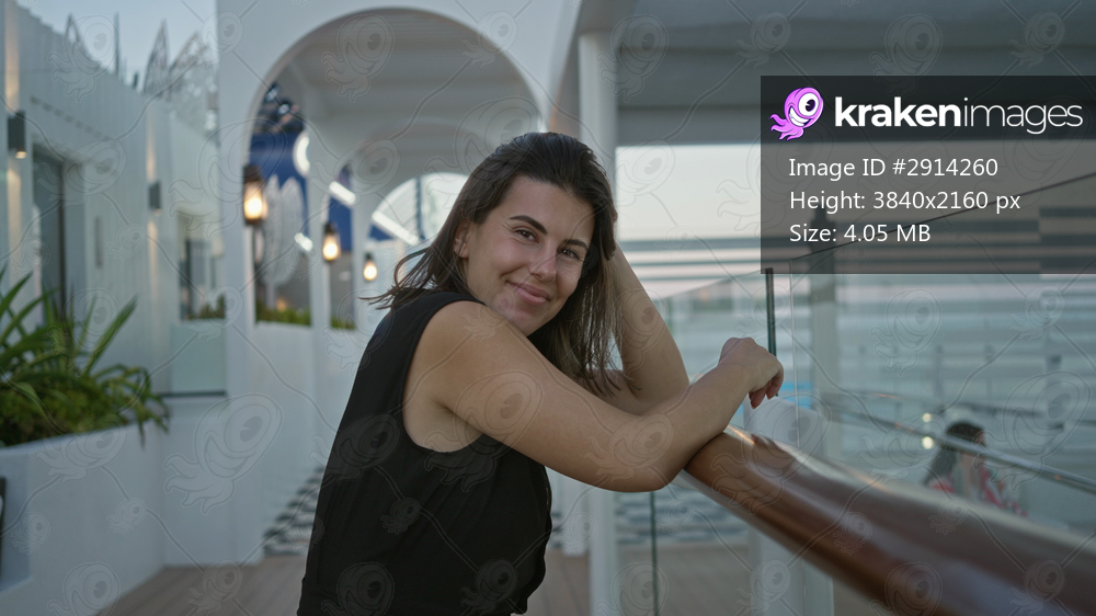 Woman leaning on glass railing on building terrace, hand resting on wooden rail and head tilted slightly; calm reflection.