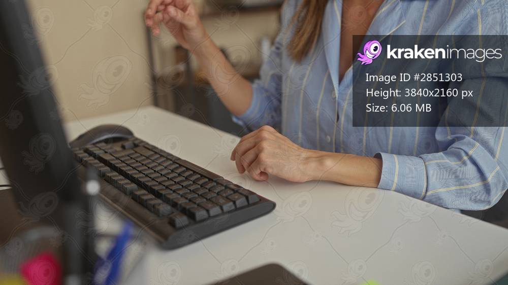 Woman leaning over desk pointing finger to computer screen in office with hand resting on keyboard; focus.