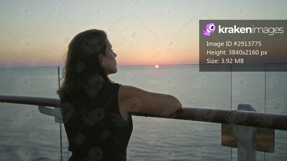Woman leans with bare arm on cruise ship deck rail looking at sunset over ocean, profile view at dusk; serenity.