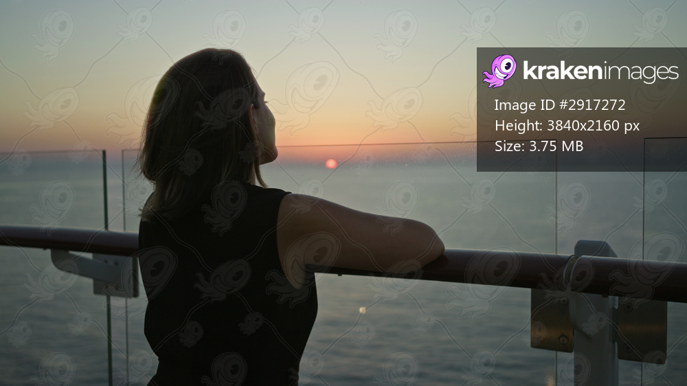 Woman leans on cruise ship rail, looking toward the horizon, showing a bare shoulder and resting hand to neck on deck at sunset; serenity.