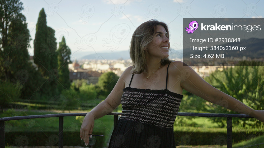 Woman leans on railing at a viewpoint over florence building, bare shoulders visible while smiling and holding sunglasses; travel joy.