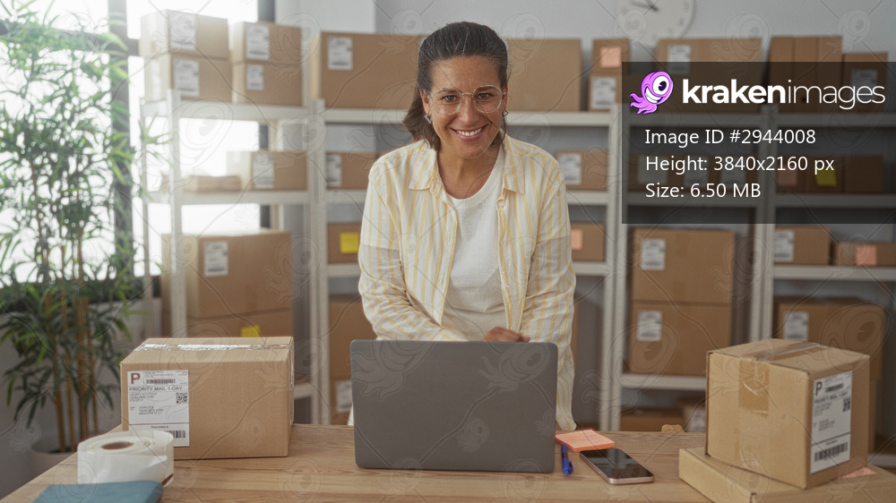 Woman leans over laptop with hands on table, arranging shipping boxes and labels in a packing area inside a building; confident entrepreneur.