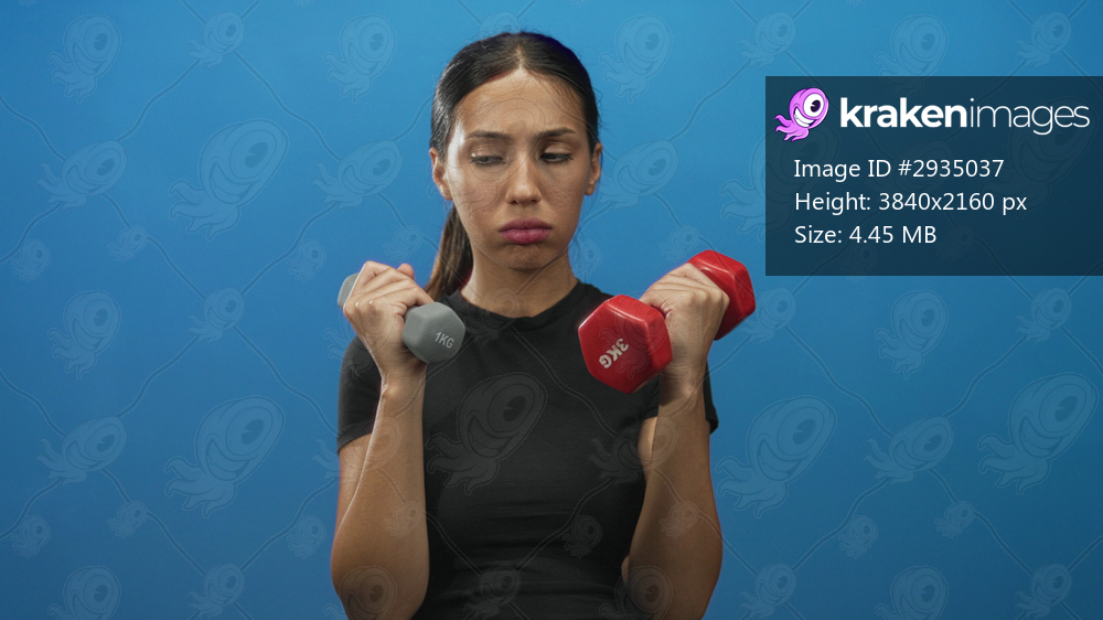 Woman lifting red and gray dumbbells with biceps curl and visible hands in studio against blue backdrop; fitness focus determination.