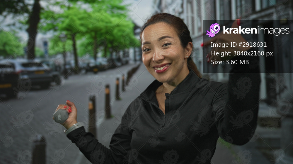Woman lifting small dumbbell on street near bollards and parked cars; confidence fitness wellbeing energy.