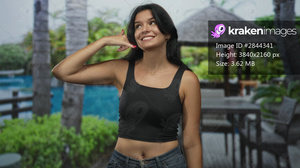 Woman lifts arm to make call gesture by pool building under bright sunlight; warm friendly greeting joy.