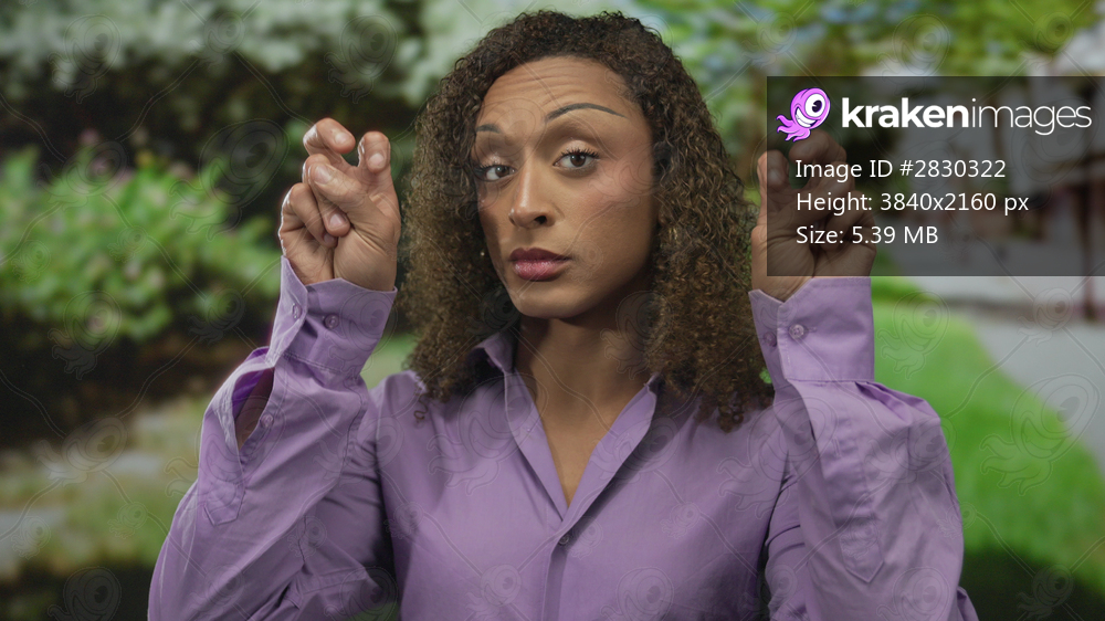 Woman lifts both hands in airquotes gesture with visible fingers in green park; sarcasm irony humor satire.