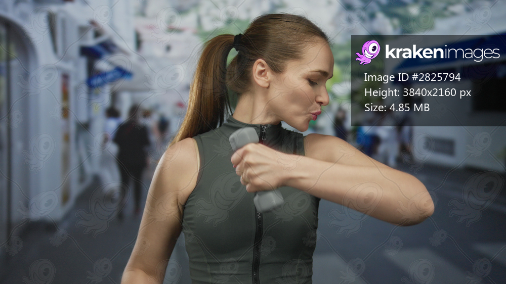Woman lifts dumbbell with bare arm muscles while wearing green sleeveless vest and smiling on street; confidence.