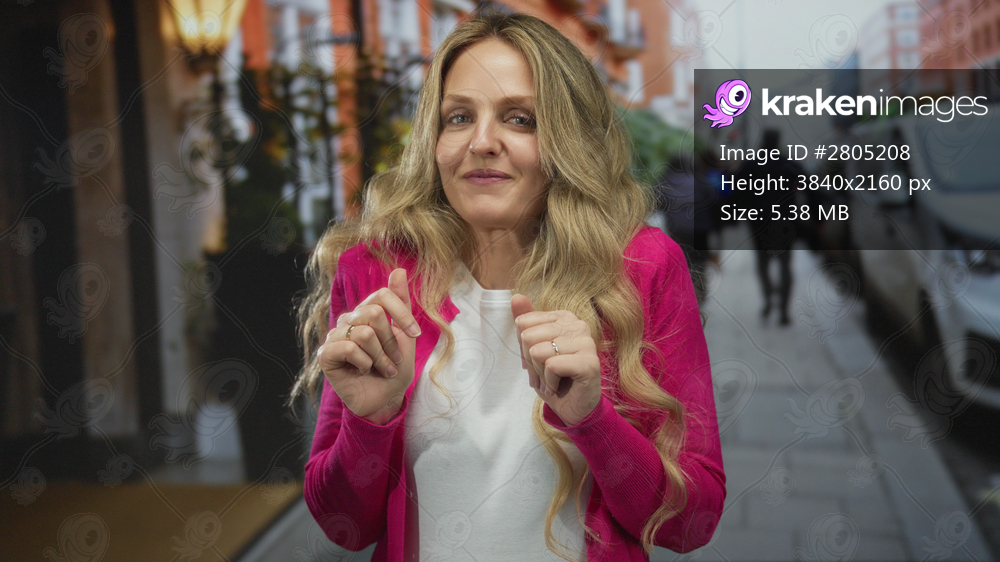 Woman lifts face in disgust expression on street with young blonde model outdoors in urban sidewalk city shot.