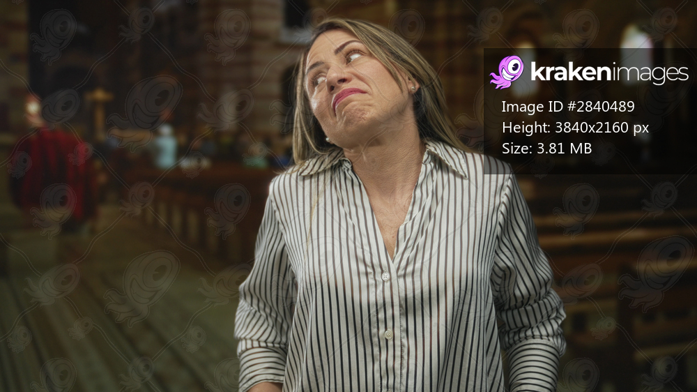 Woman lifts face toward sunlit stained glass inside vaulted church nave with wooden pews and mosaic floor; serenity.